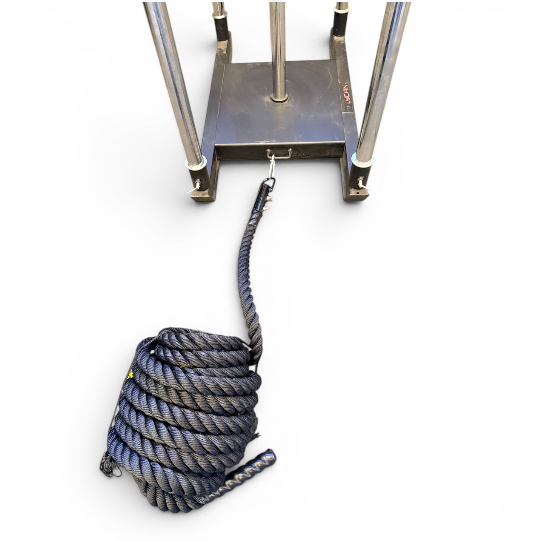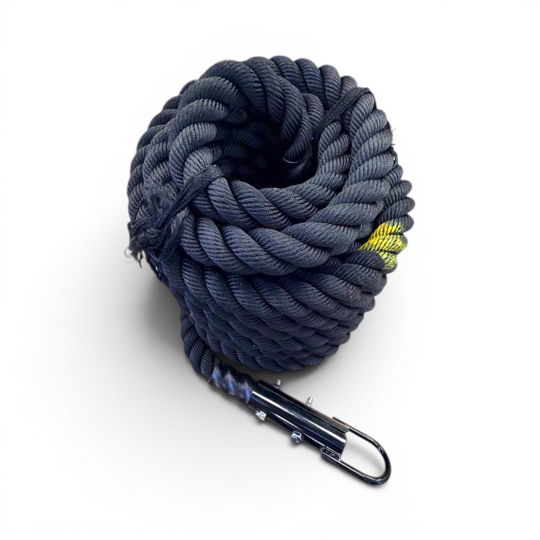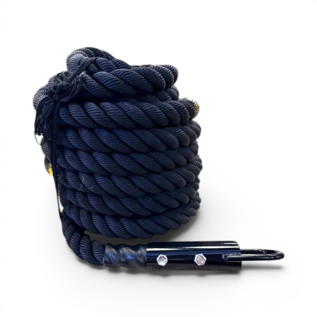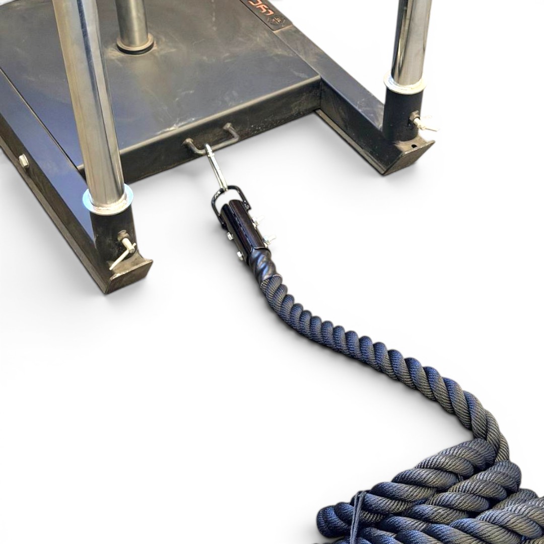 Incorpora un gancho metálico en forma de U que facilita una conexión rápida y firme a trineos o estructuras, optimizando la transición entre ejercicios. Además, cuenta con marcas visuales cada 3 metros que permiten monitorear el avance durante el entrenamiento.