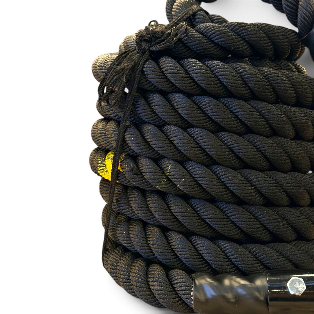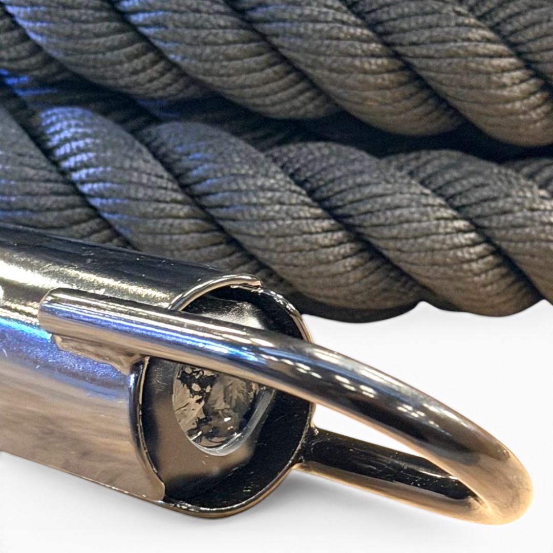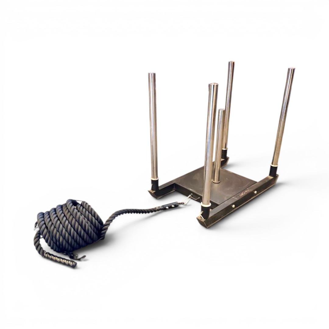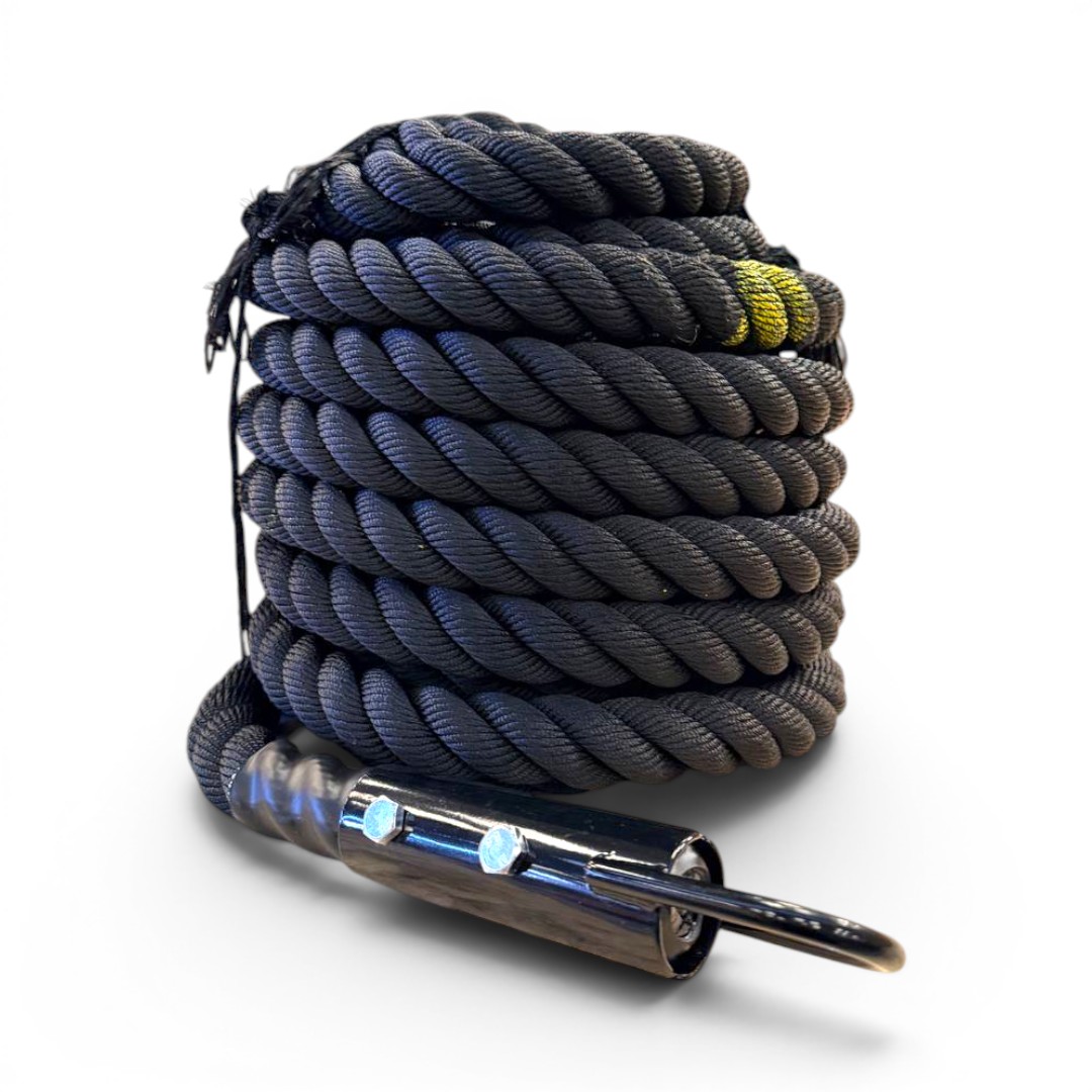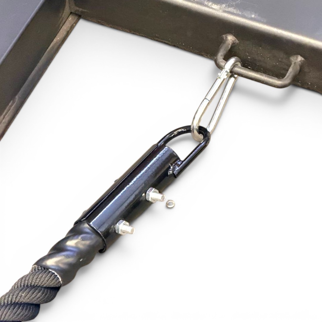 Incorpora un gancho metálico en forma de U que facilita una conexión rápida y firme a trineos o estructuras, optimizando la transición entre ejercicios. Además, cuenta con marcas visuales cada 3 metros que permiten monitorear el avance durante el entrenamiento.