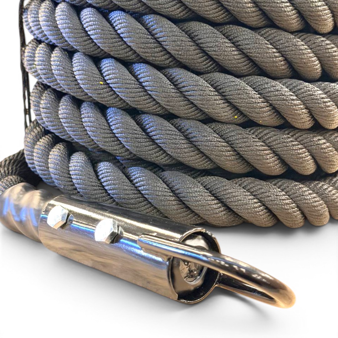 Cabo de 15 metros con gancho metálico, ideal para arrastre de trineo y entrenamiento funcional.