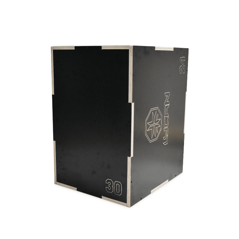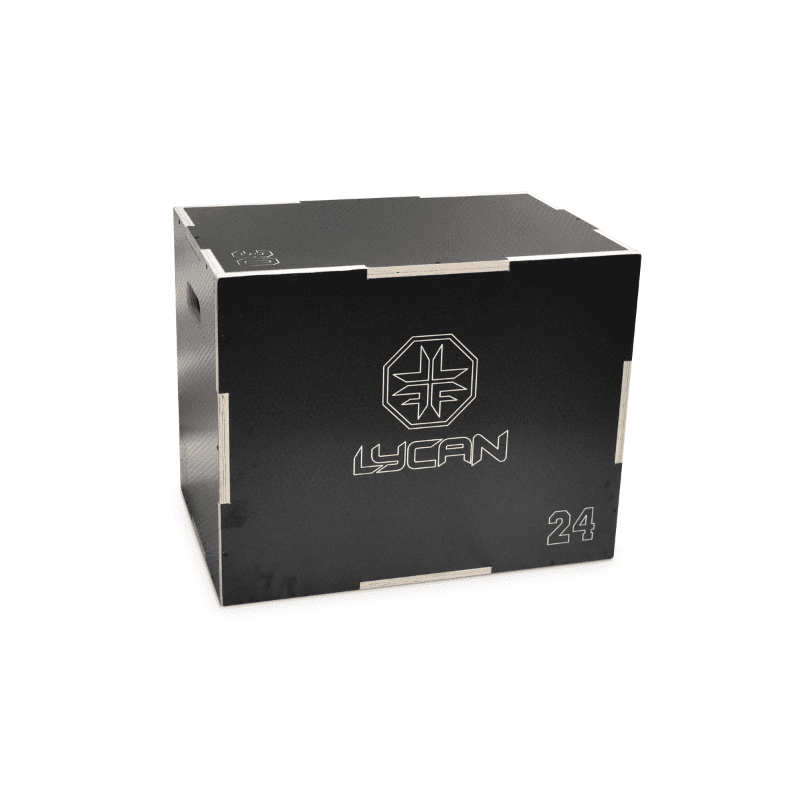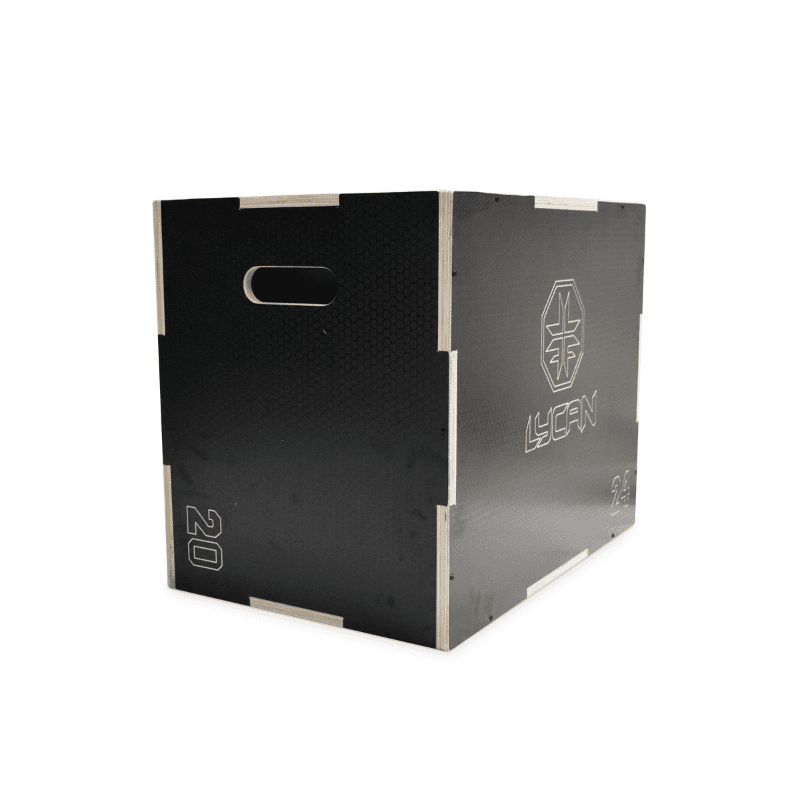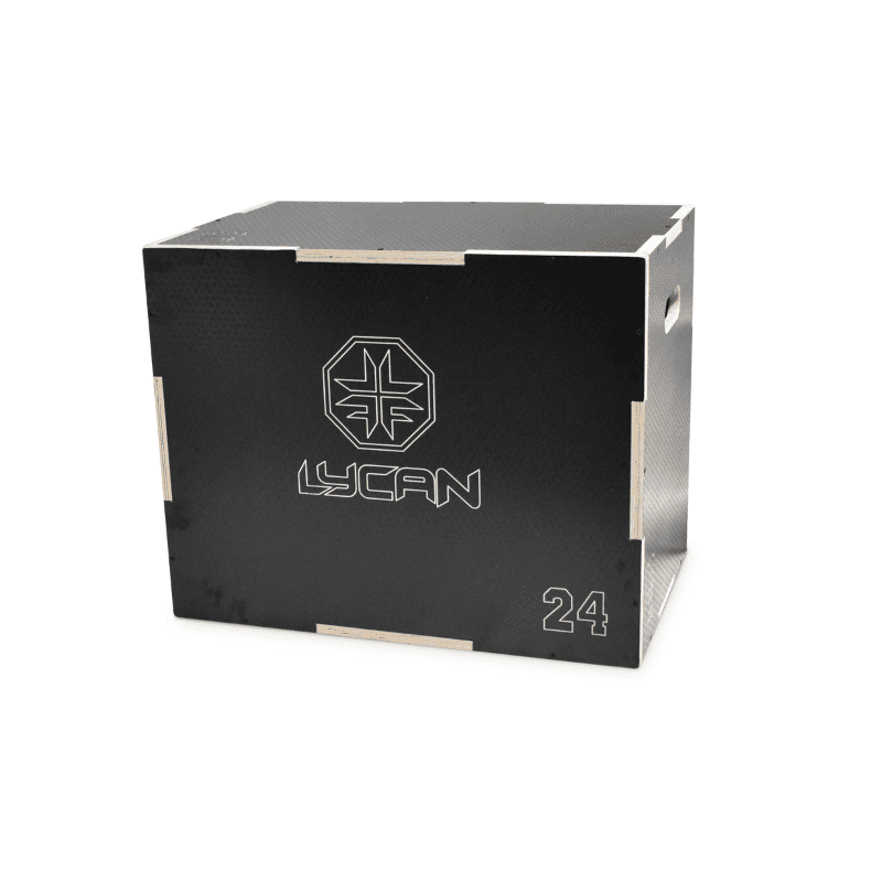 Caja pliométrica de madera LYCAN con cobertura antideslizante. Alturas múltiples: 20”, 24” y 30”. Ideal para saltos, coordinación, fuerza y equilibrio.