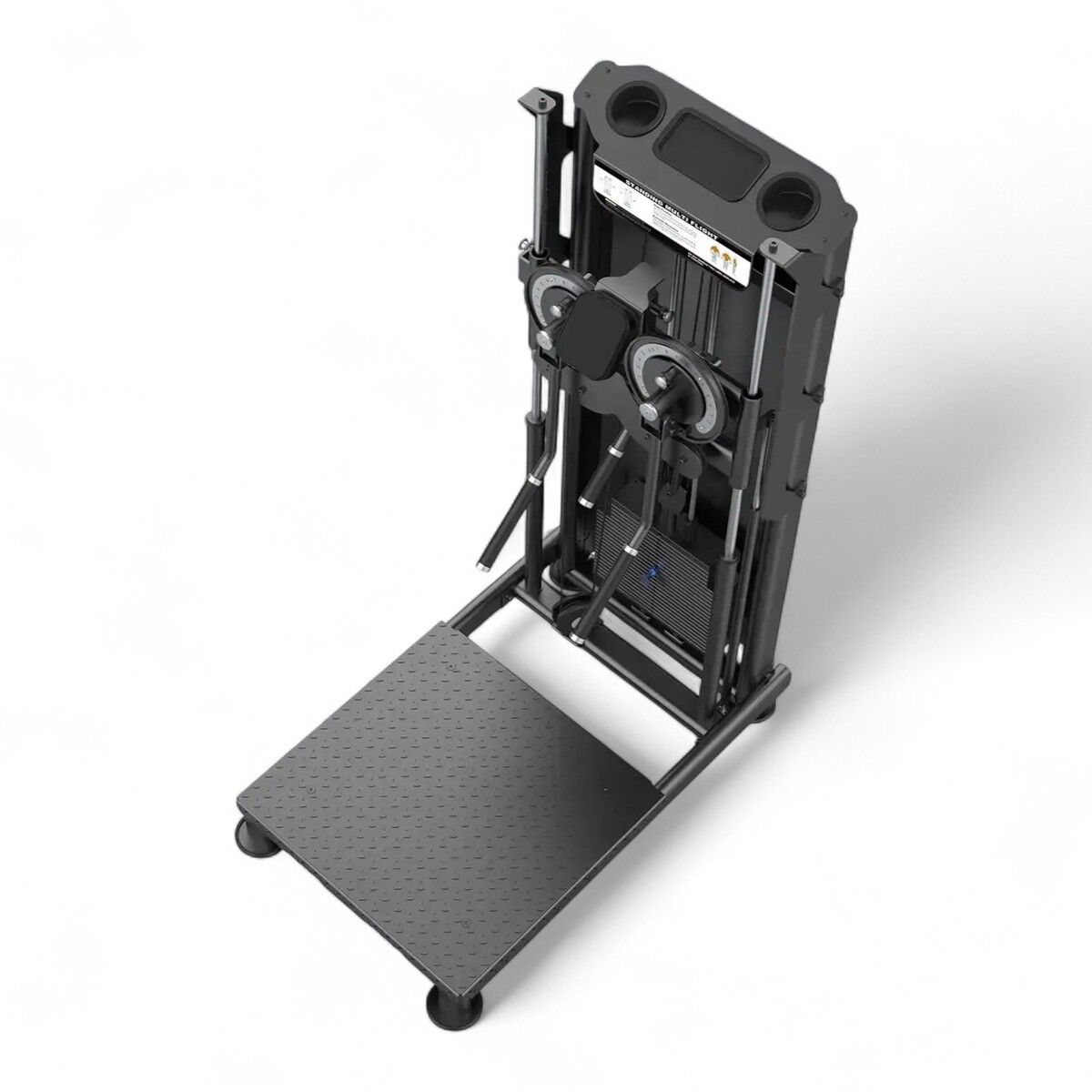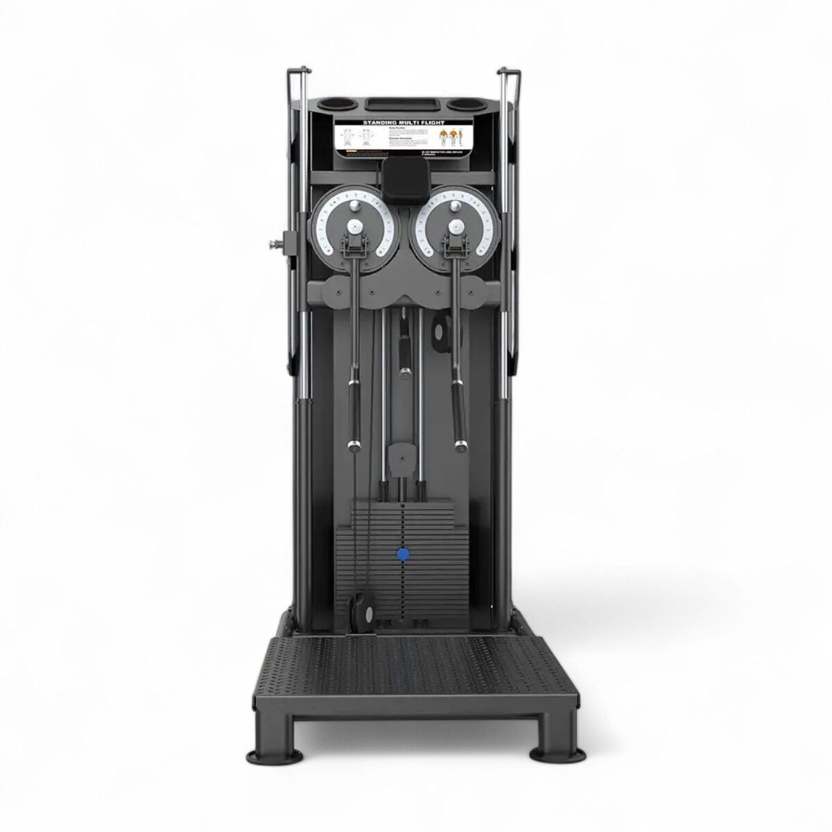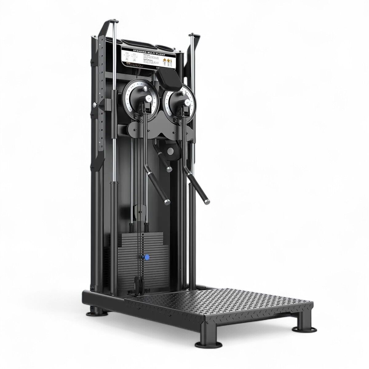 Máquina profesional para deltoides y pecho, con carga variable, brazos ajustables y placas integradas. Entrenamiento de pie con estabilidad y seguridad.