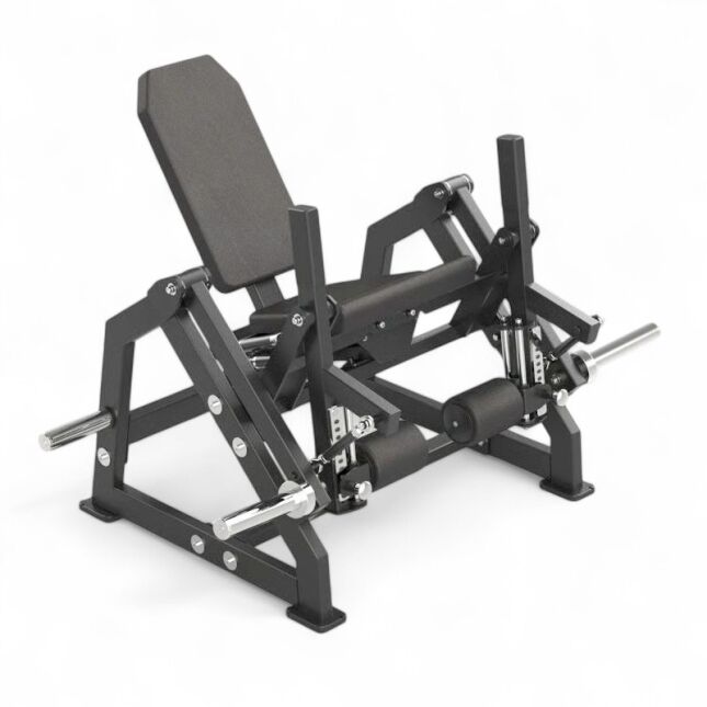 Máquina iso-lateral de extensión de pierna con carga por discos para trabajo enfocado de cuádriceps.