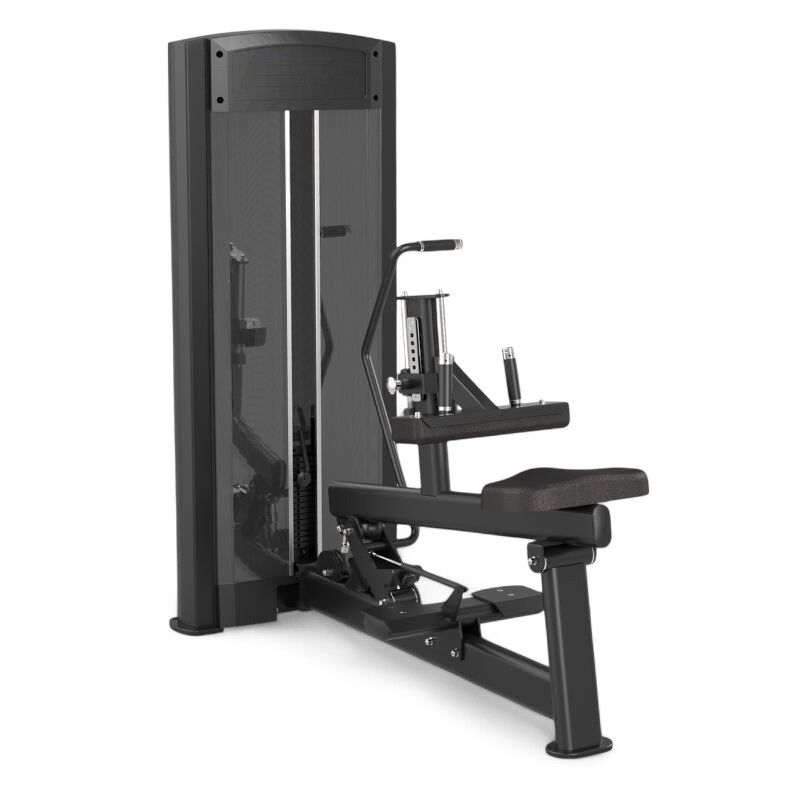 Máquina de pantorrillas sentado con asiento ergonómico y selector de peso.