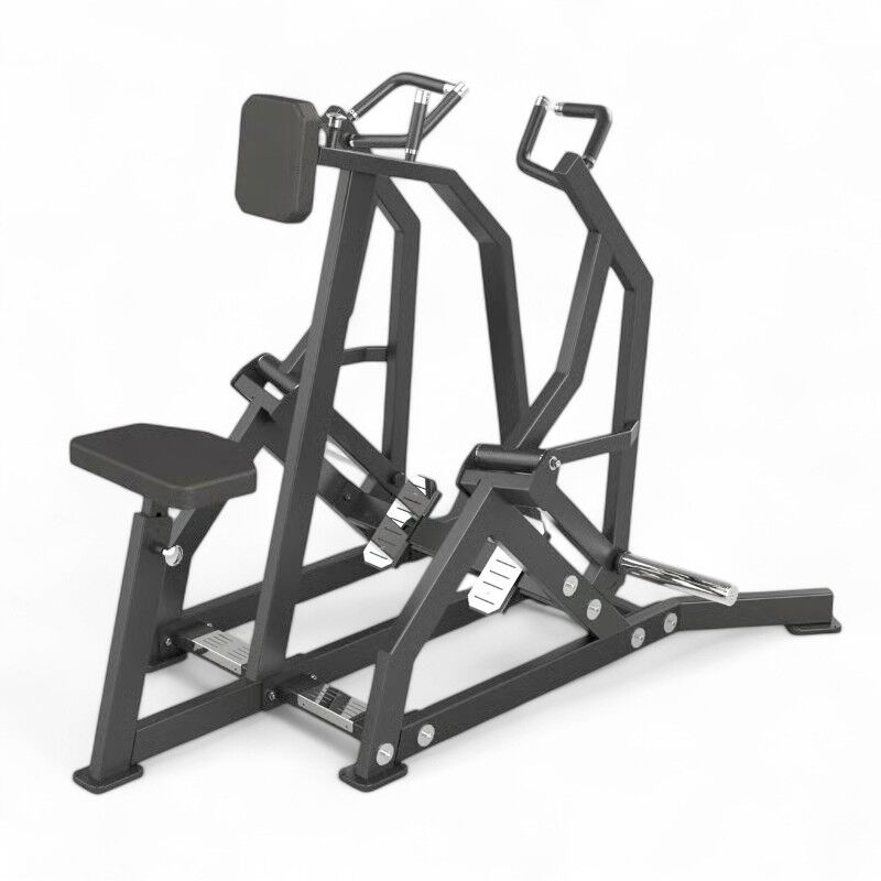 Máquina de tracción horizontal con carga por discos y múltiples agarres para trabajo completo de espalda.