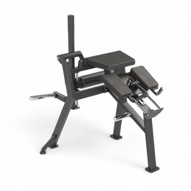 Máquina especializada para entrenamiento de glúteos con carga plate-loaded.